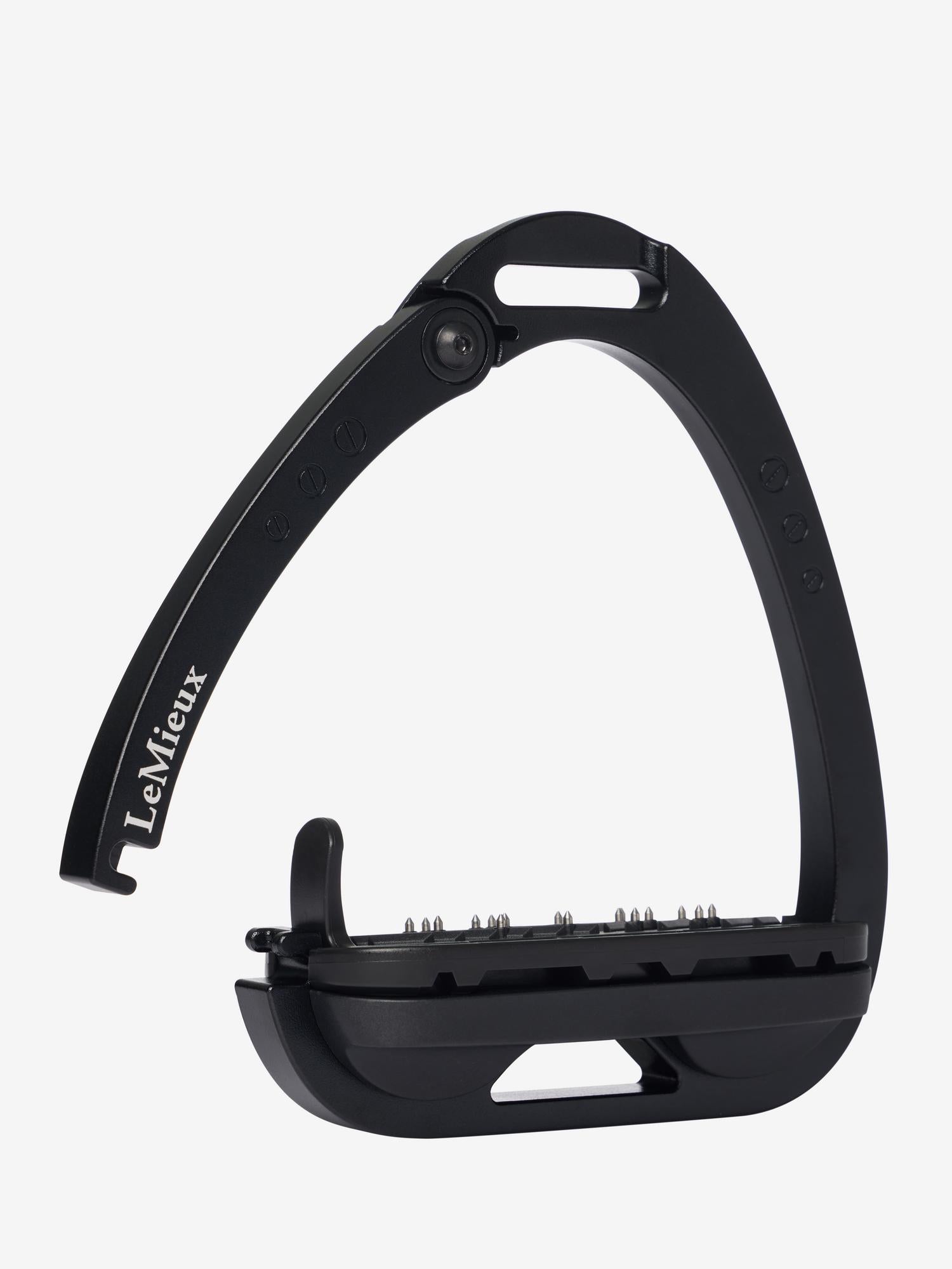 An integrated safety arm has a two-stage release system, preventing unintentional opening. The spring loaded safety arm locks into the base of the main frame meaning that when under maximum pressure, such as landing over a fence, the rider's weight is spread evenly across the stirrup, preventing the outside dropping and flexing. When pressure is put onto the arm of the stirrup, such as if the rider falls, the arm releases allowing the foot to come out of the stirrup and preventing it getting stuck